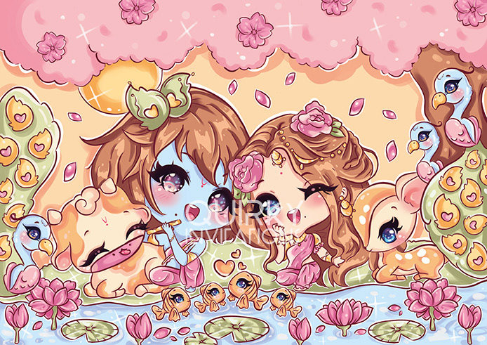 Cute baby Radha Krishna painting in Chibi style, painted in pastel colors using Adobe Photoshop