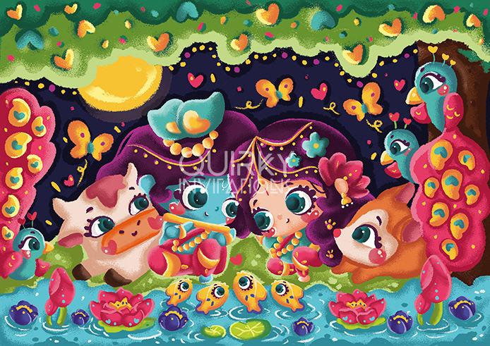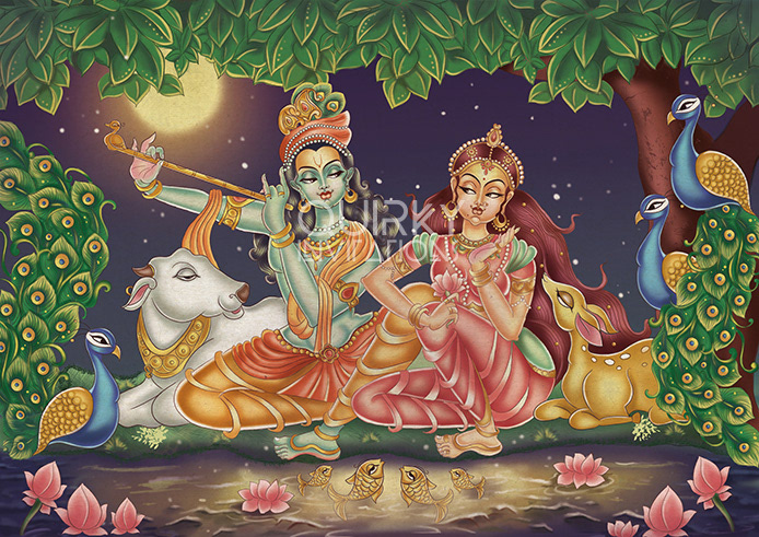 The cute little Radha Krishna in vridhavan surrounded by the surreal flora and fauna painted using airbrushing in Photoshop