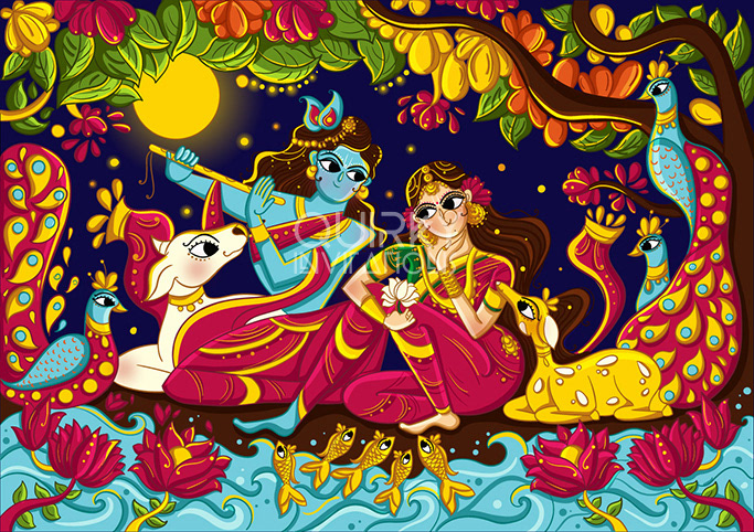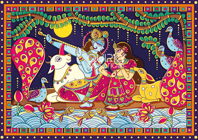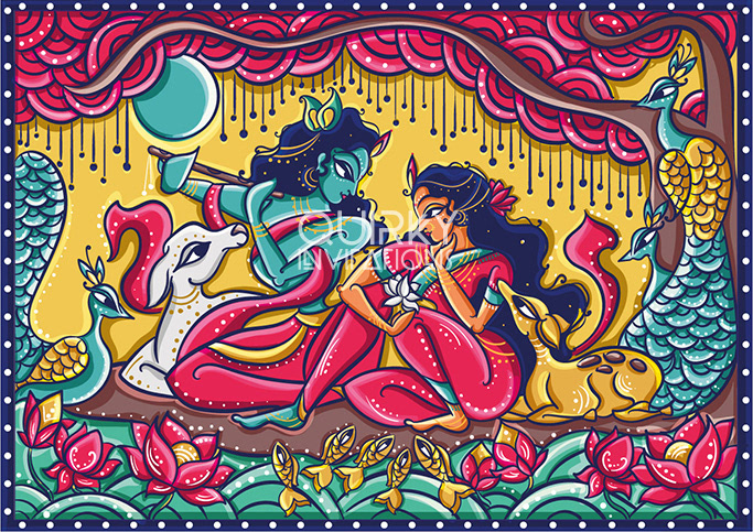 Radha Krishna painting in Indian folk art Bengal Pattachitra, a contemporary version of Jamini Roy’s painting illustrated in Adobe Illustrator