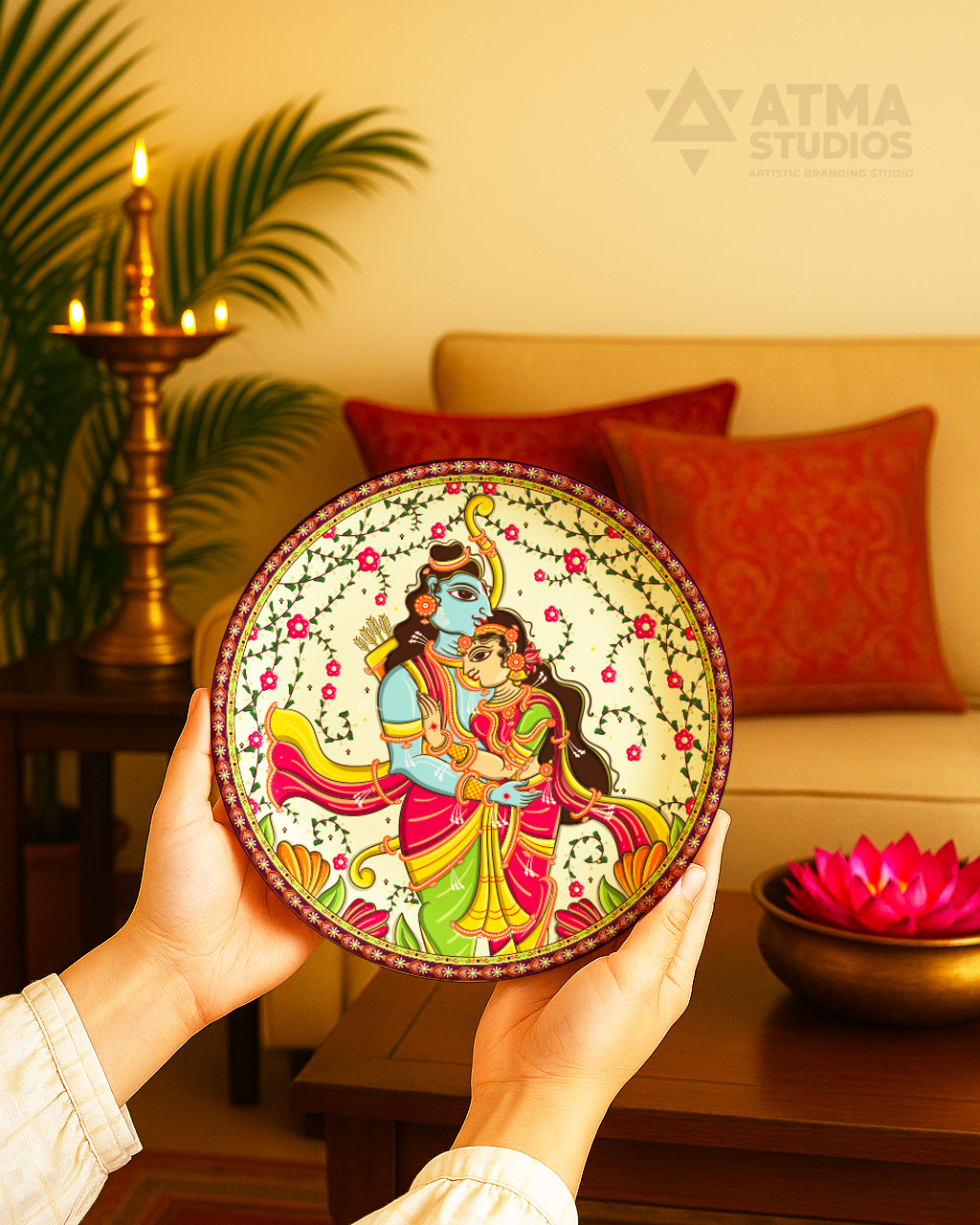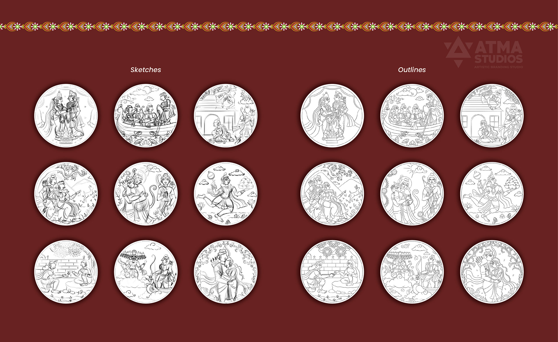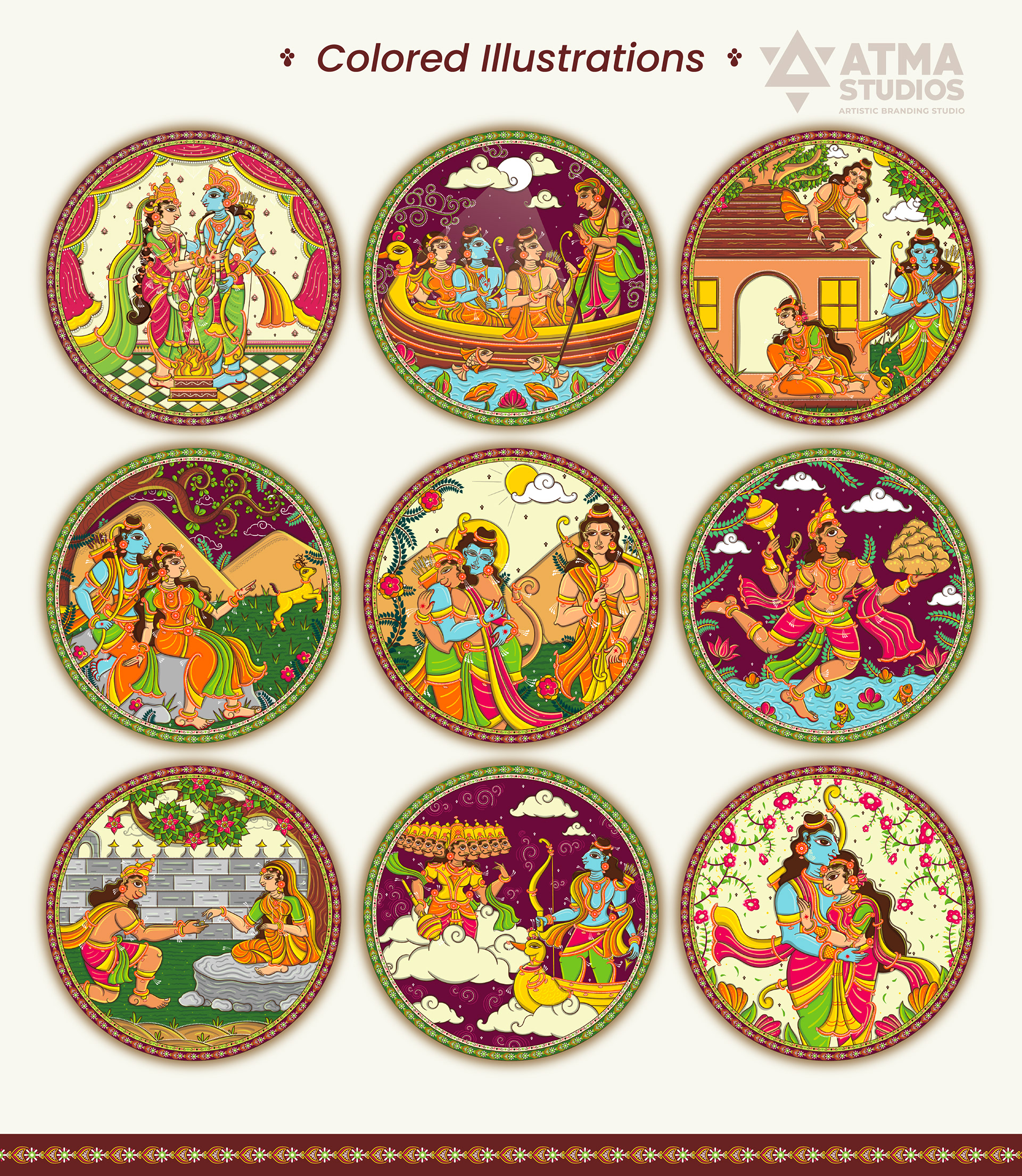 Ritualistic, a brand devoted to reviving Indian traditions through mindful living, approached Atma Studios to bring an epic to the walls— The Ramayana in 9 Wall Plates. Their vision was to create a statement art series that didn’t just decorate, but narrated. Each wall plate was illustrated in the intricate Pattachitra art style, capturing iconic moments—from exile to victory. We wove mythology with heritage, designing a visual journey that feels both timeless and sacred. The result is a soulful collection that transforms storytelling into ritual, and walls into sanctuaries.