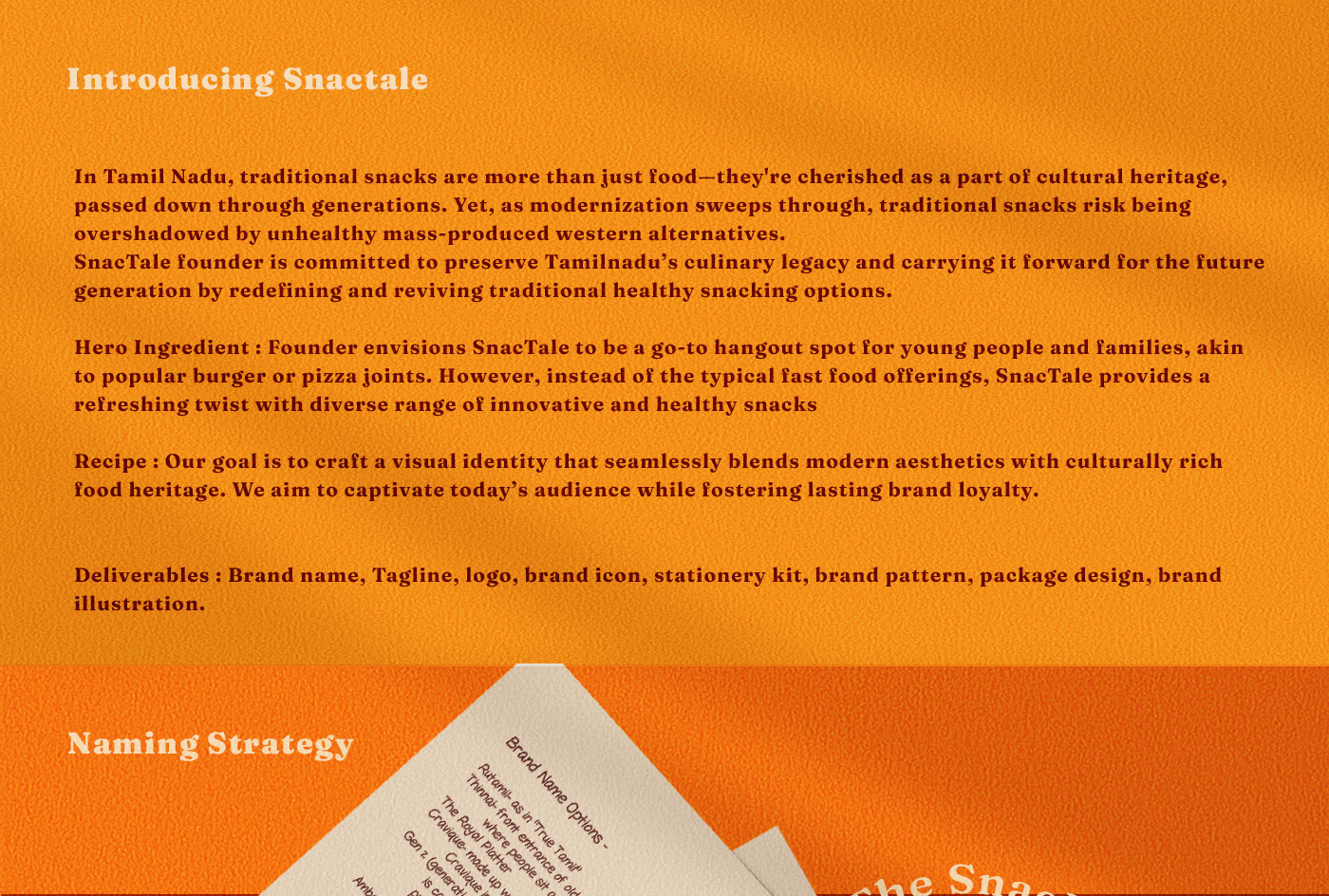 Snactale combines Tamil Nadu’s traditional flavors with a modern, vibrant brand identity. Through market research and strategic branding, we’ve created a cohesive, visually engaging experience that celebrates heritage with a contemporary twist.