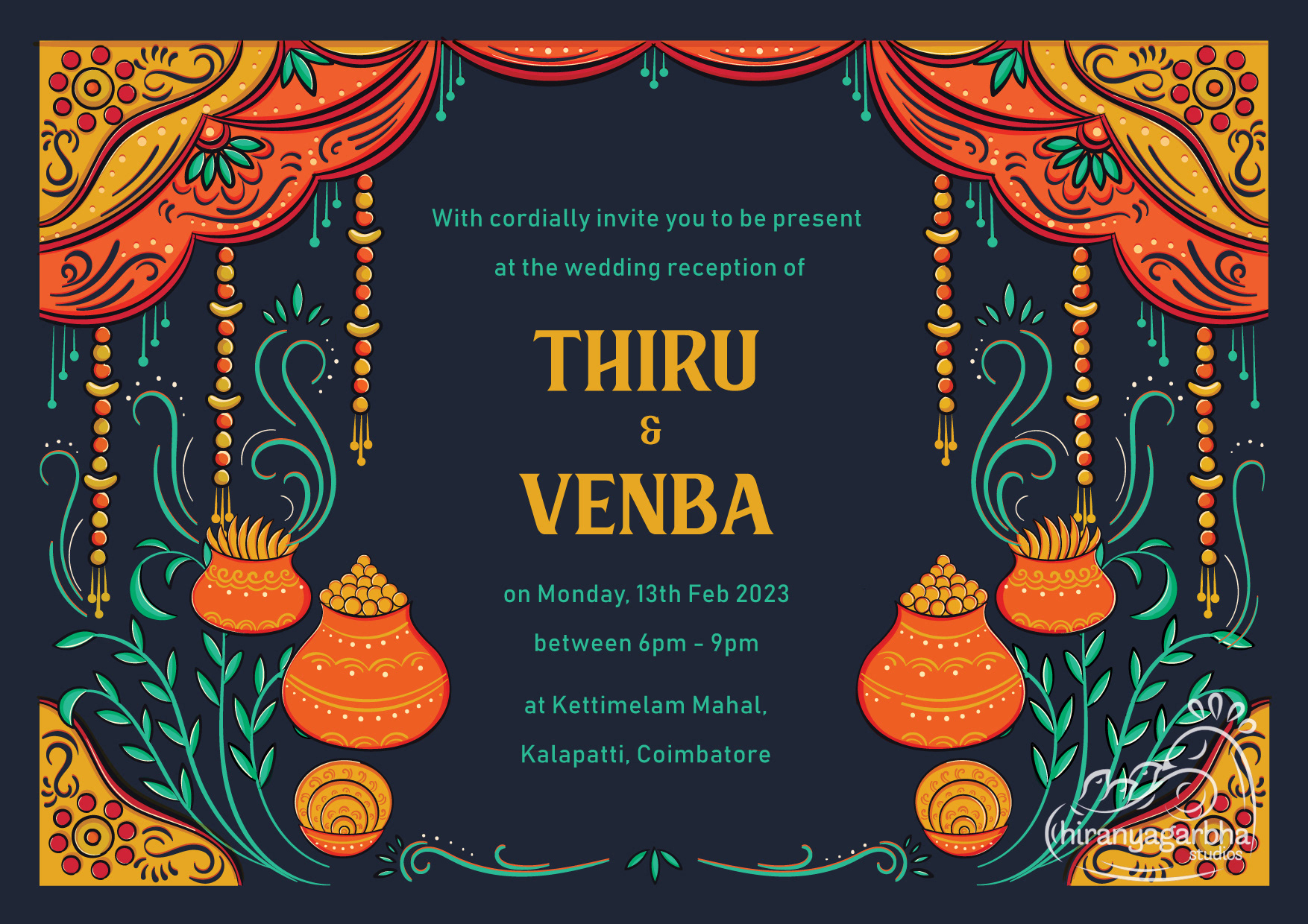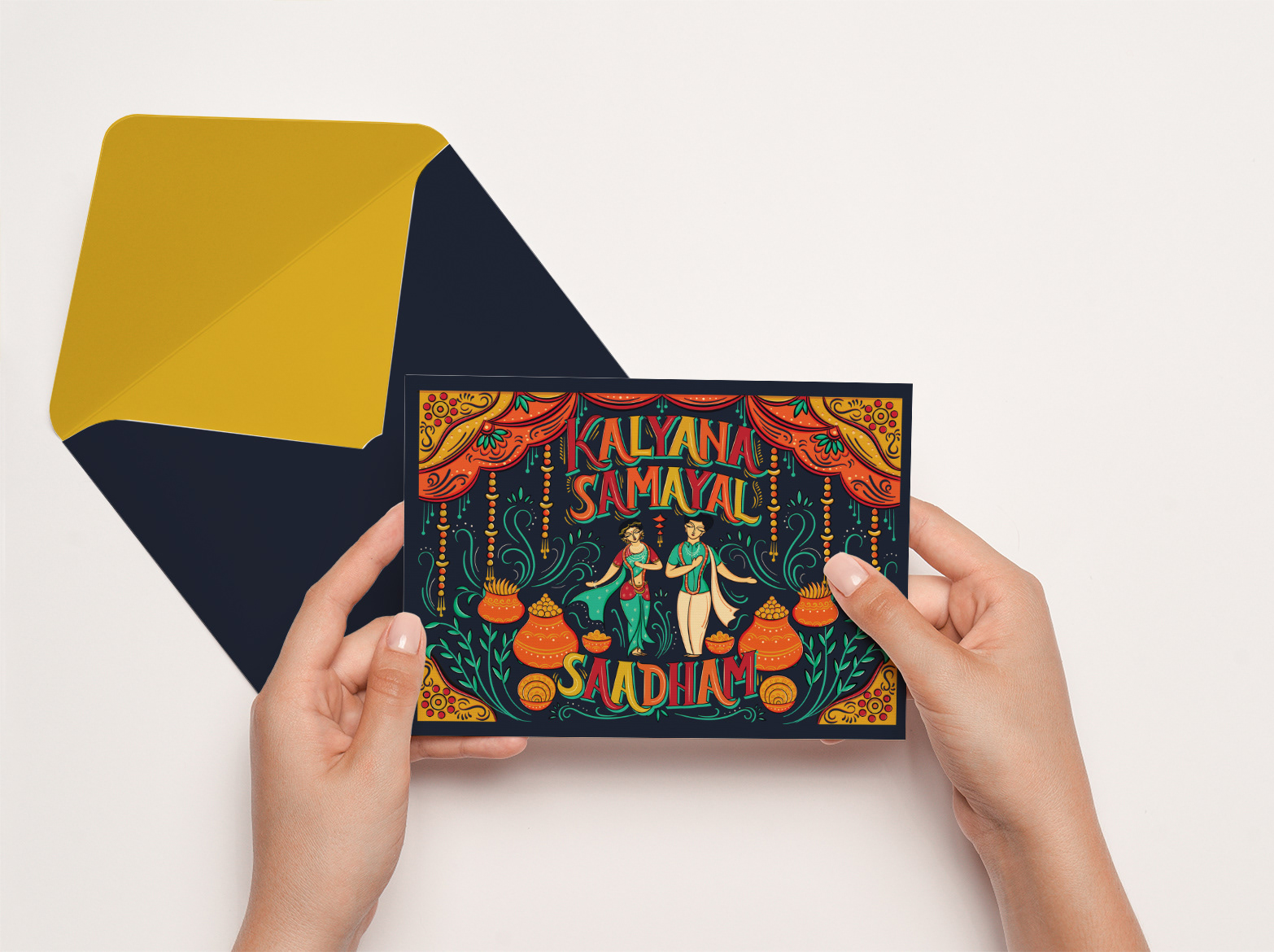 Overall, this illustrated lettering wedding invite perfectly captures the joy and excitement of a traditional South Indian wedding feast, inviting your loved ones to share in the love and laughter of your special day.