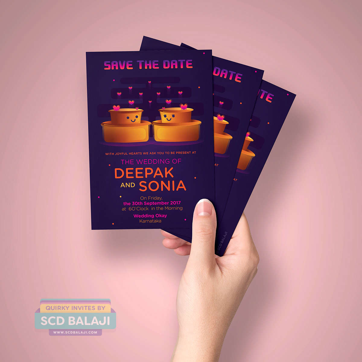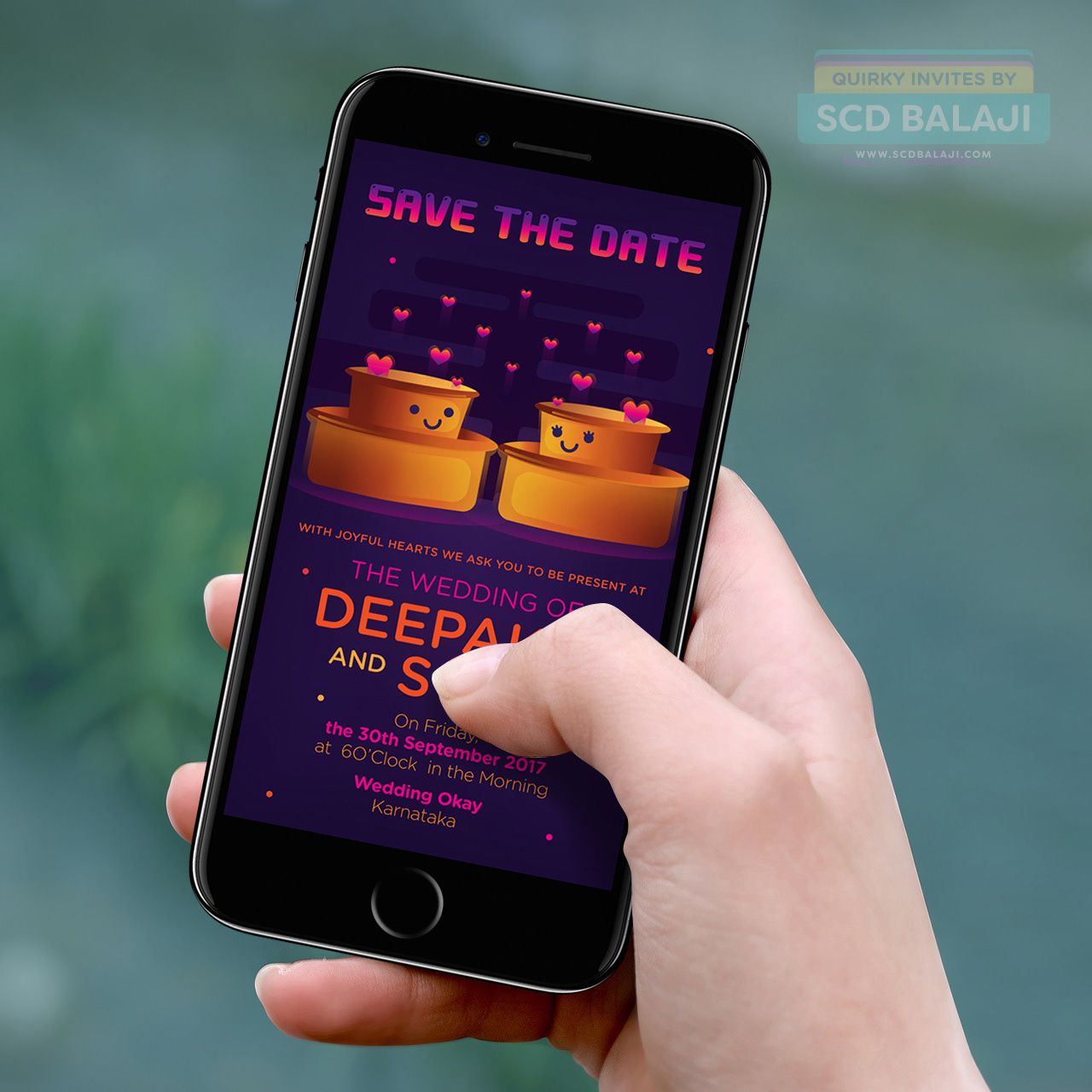 When someone loves you more than he loves his filter coffee, marry him “ For all the Tamil Brahmins, their first love will always be filter coffee. As we take a small sip from the copper tumbler, everything else on your mind stays away and the coffee starts talking to your inner soul. When you love someone more than you love your filter coffee, you have found your soulmate. It’s time to let your folks know you are getting married. This unique Tambrahm wedding - save the date card has cute illustration of two filter coffees in love and it is sure to put a smile on the viewer’s face. Your Tambrahm family and friends will never forget a wedding invite that had filter coffee on it and that makes this the perfect “ Save the Date “ card.
