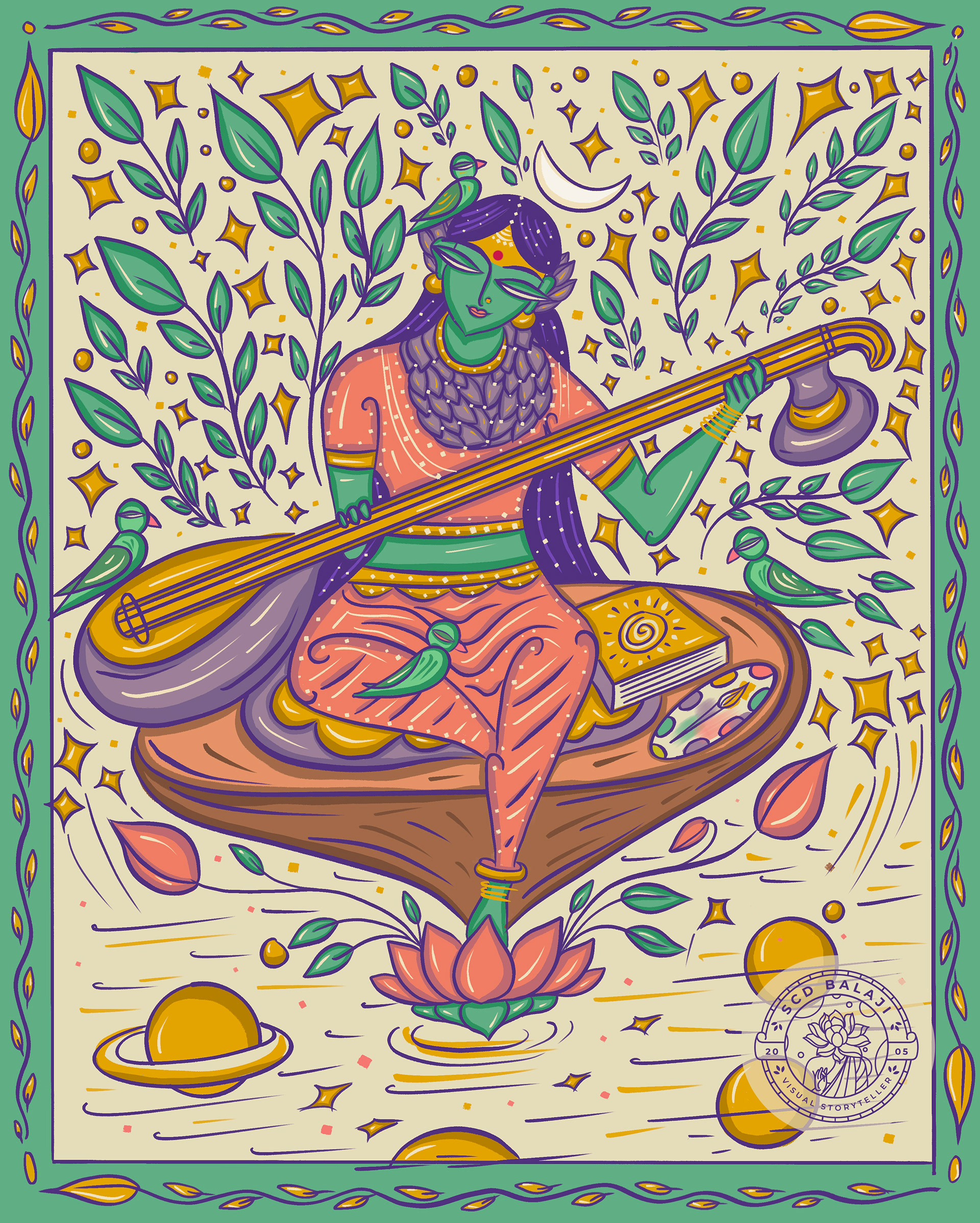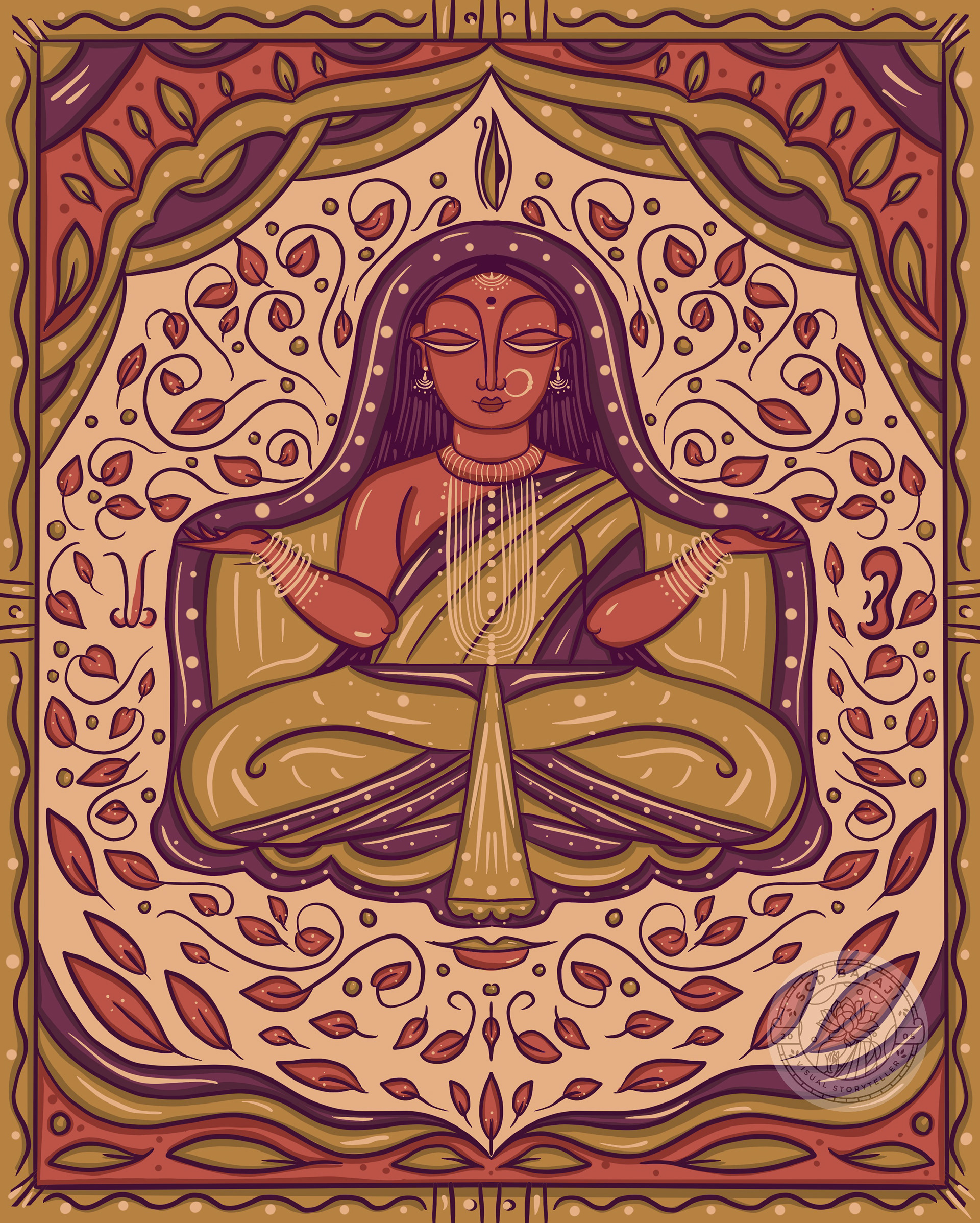 Wearing a garland of mystical purple lotus with the parrots on either side depicting speech and inner knowledge, the nurturing Mother Goddess represents the “power of the spoken word”.