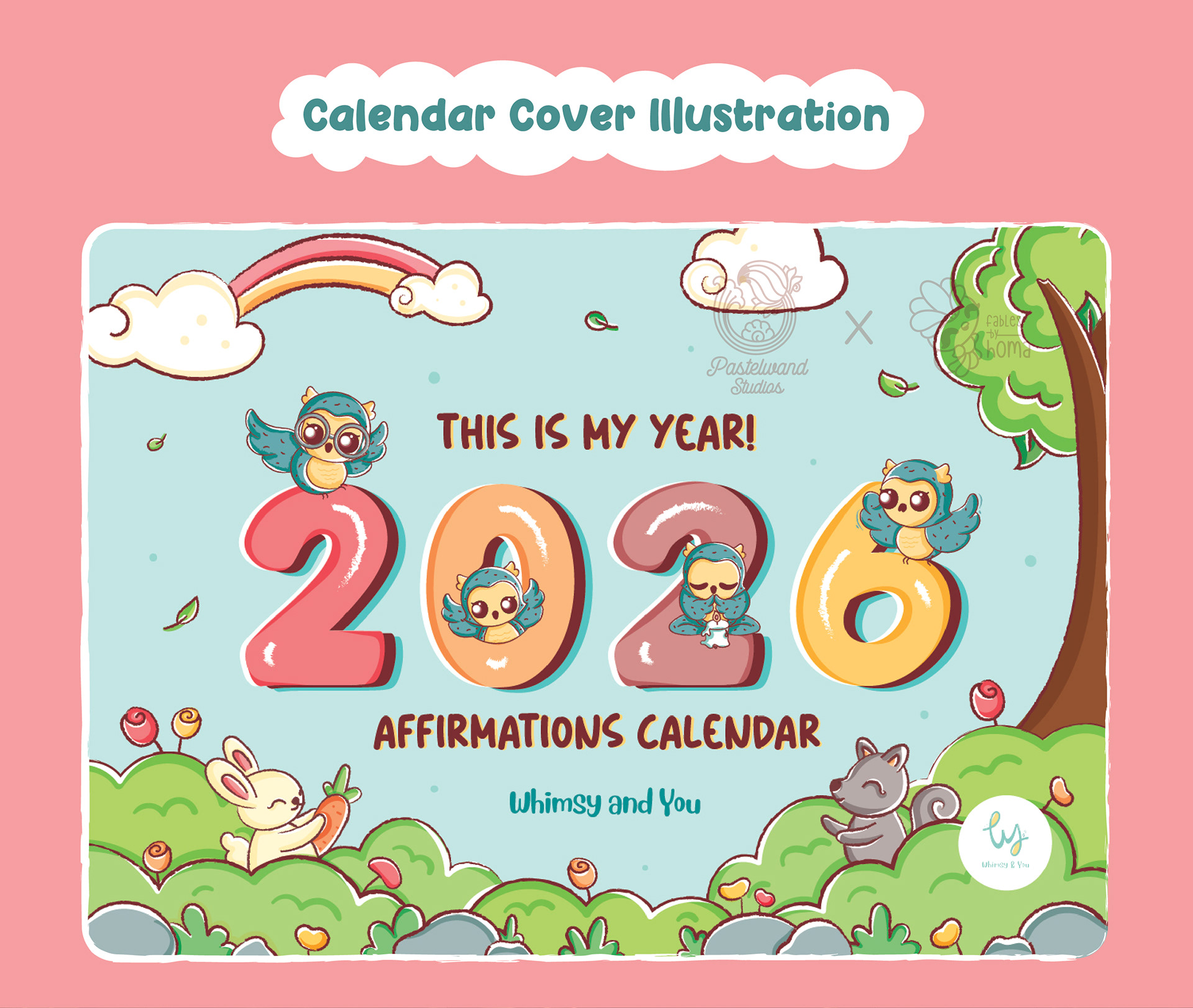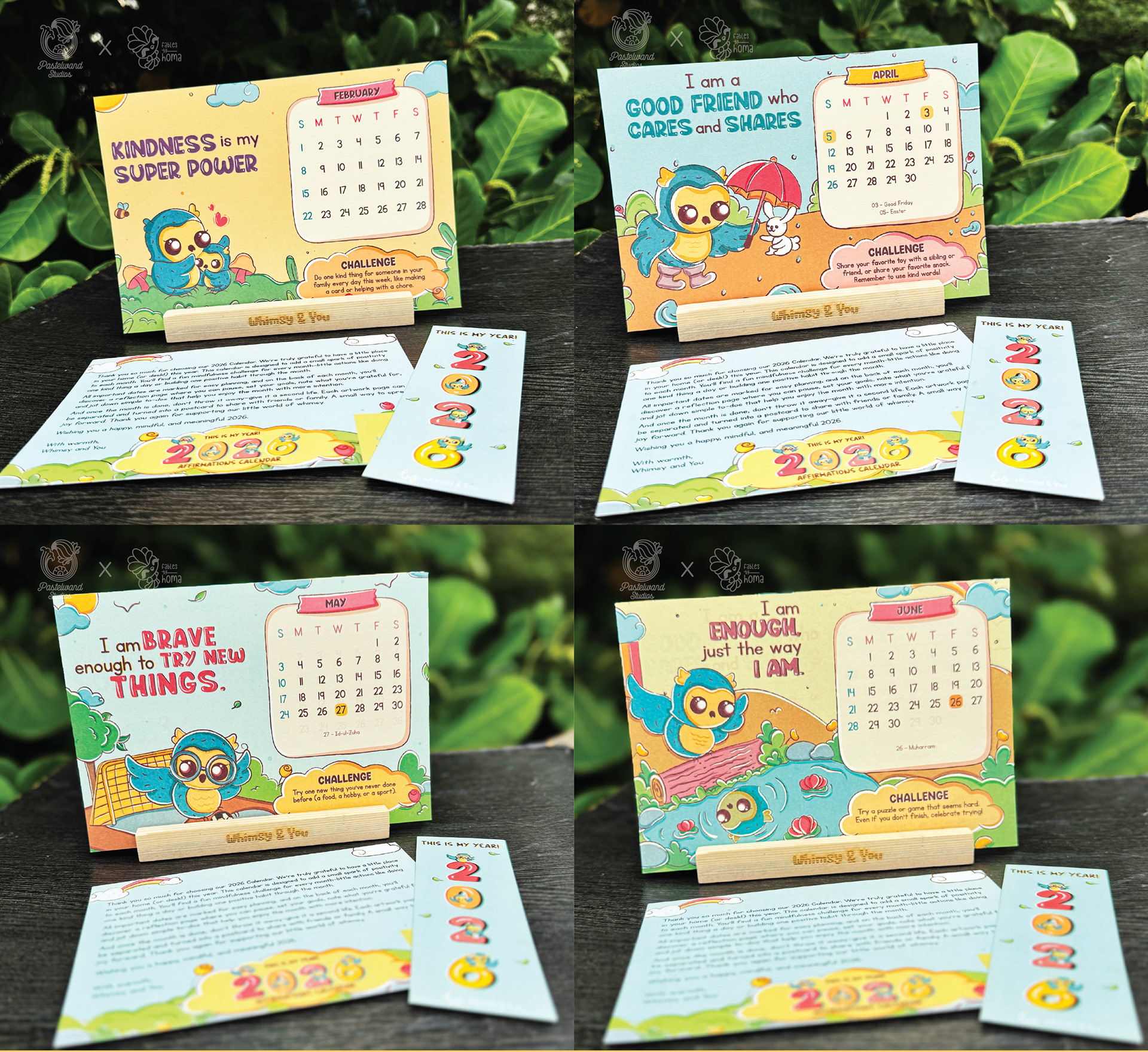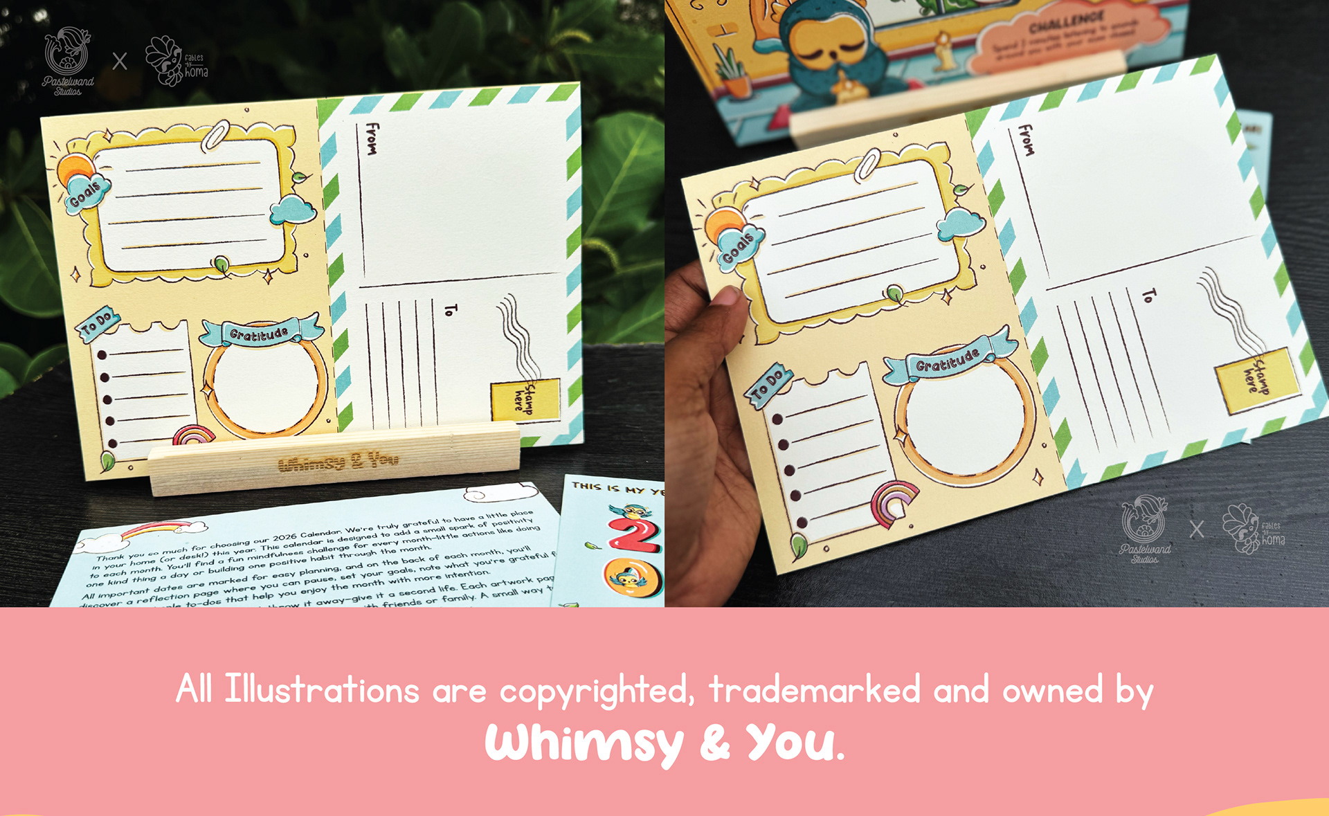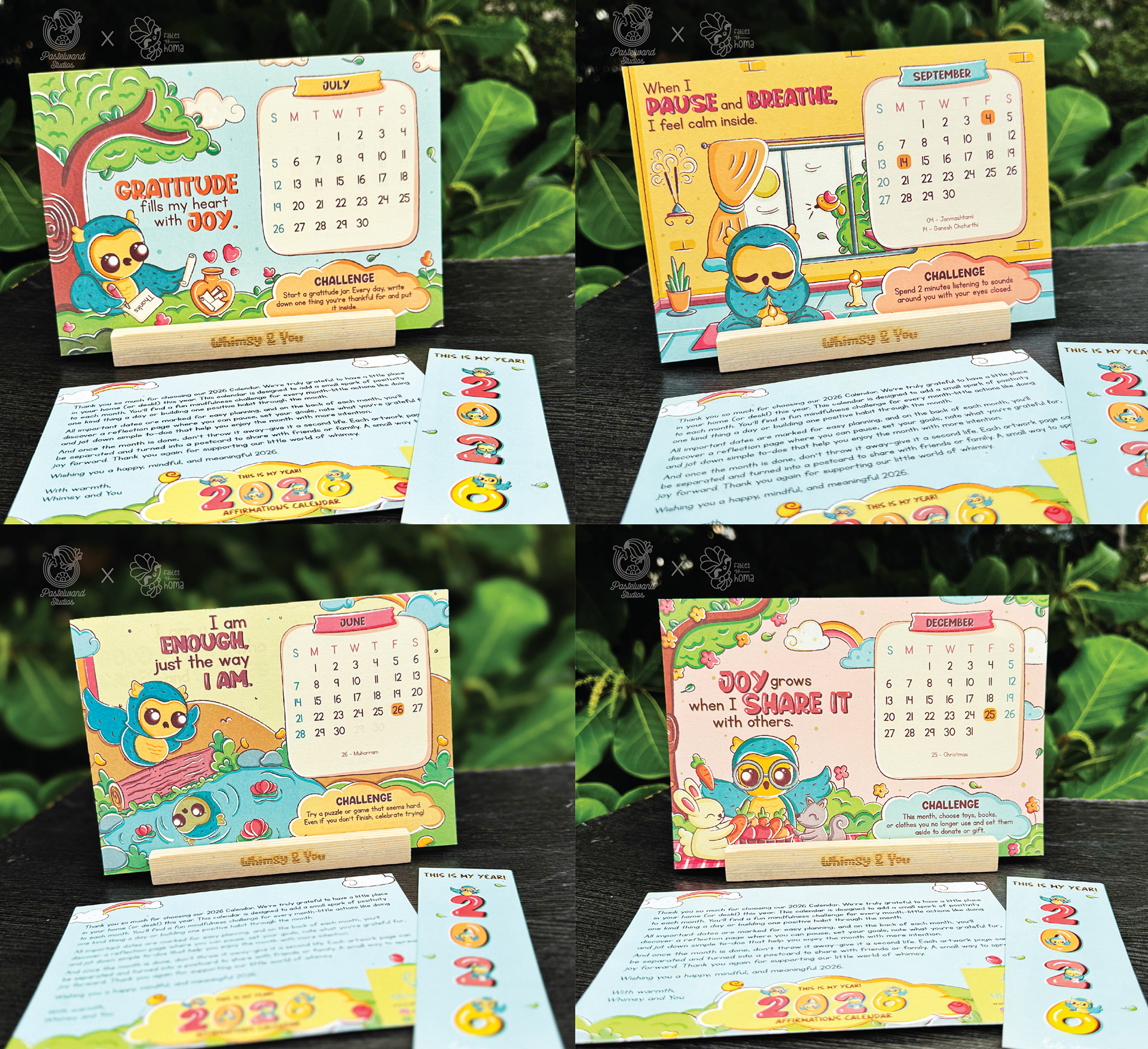 The Whimsy & You 2026 Affirmation Calendar was created to support children in building positive habits and emotional awareness in a simple, approachable way. Each month features a clear affirmation paired with a small, child-friendly challenge that encourages reflection, kindness, and mindfulness. The brand mascot, Whimsy, appears across all illustrations, helping reinforce each message through everyday, relatable actions. The calendar follows a postcard-style format, with the reverse side offering space for goals, gratitude, and important to-dos. Once the month ends, each page can be reused as a postcard or kept as a memory. Designed to sit on a desk or shelf, the calendar balances function and warmth for everyday use.