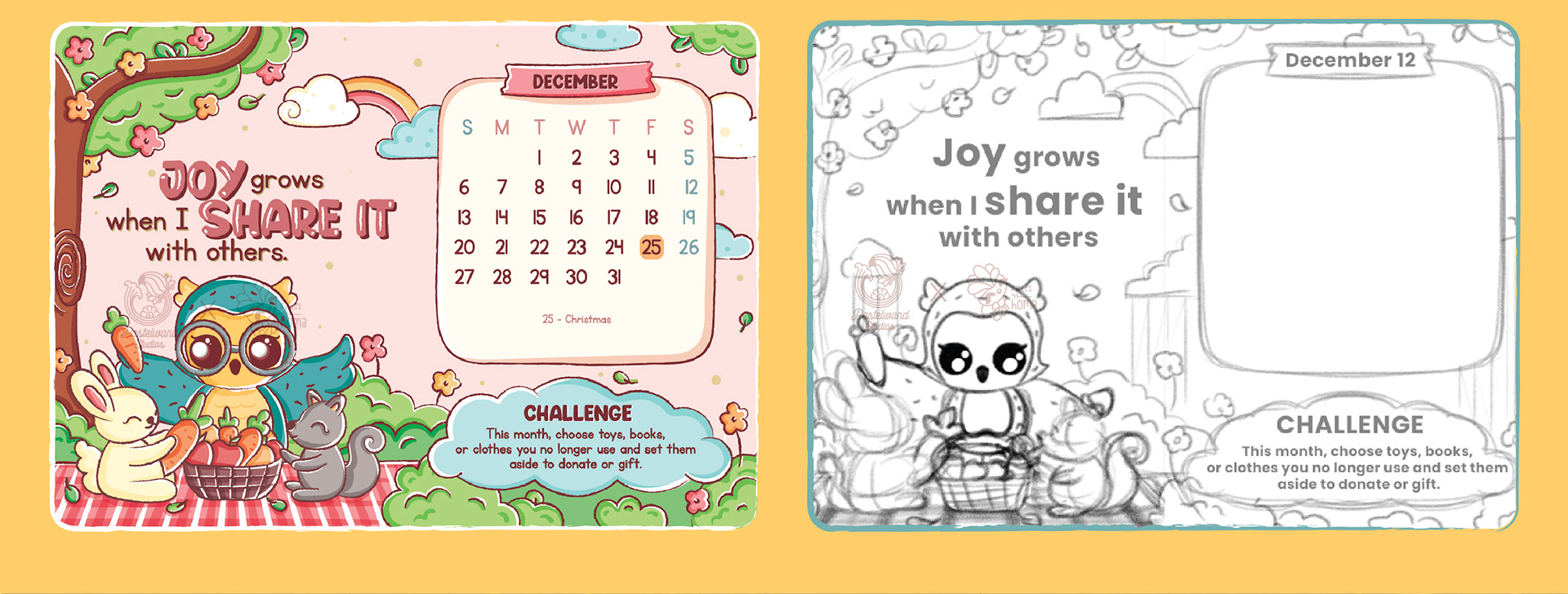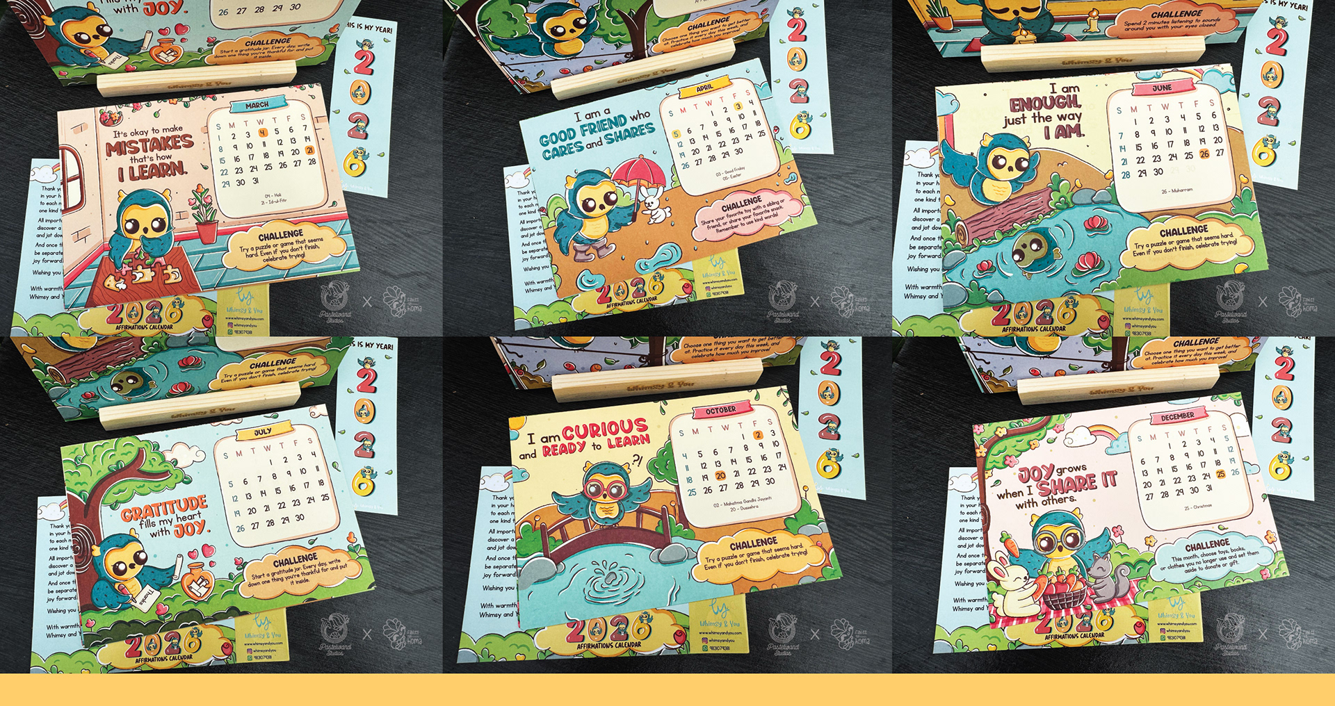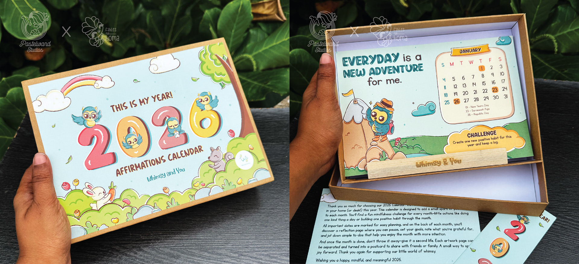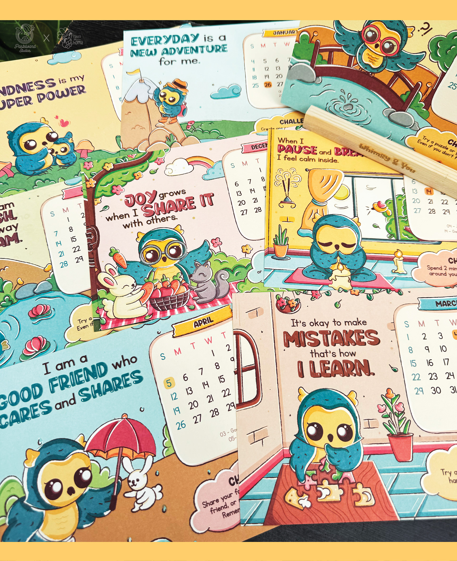 The Whimsy & You 2026 Affirmation Calendar was created to support children in building positive habits and emotional awareness in a simple, approachable way. Each month features a clear affirmation paired with a small, child-friendly challenge that encourages reflection, kindness, and mindfulness. The brand mascot, Whimsy, appears across all illustrations, helping reinforce each message through everyday, relatable actions. The calendar follows a postcard-style format, with the reverse side offering space for goals, gratitude, and important to-dos. Once the month ends, each page can be reused as a postcard or kept as a memory. Designed to sit on a desk or shelf, the calendar balances function and warmth for everyday use.