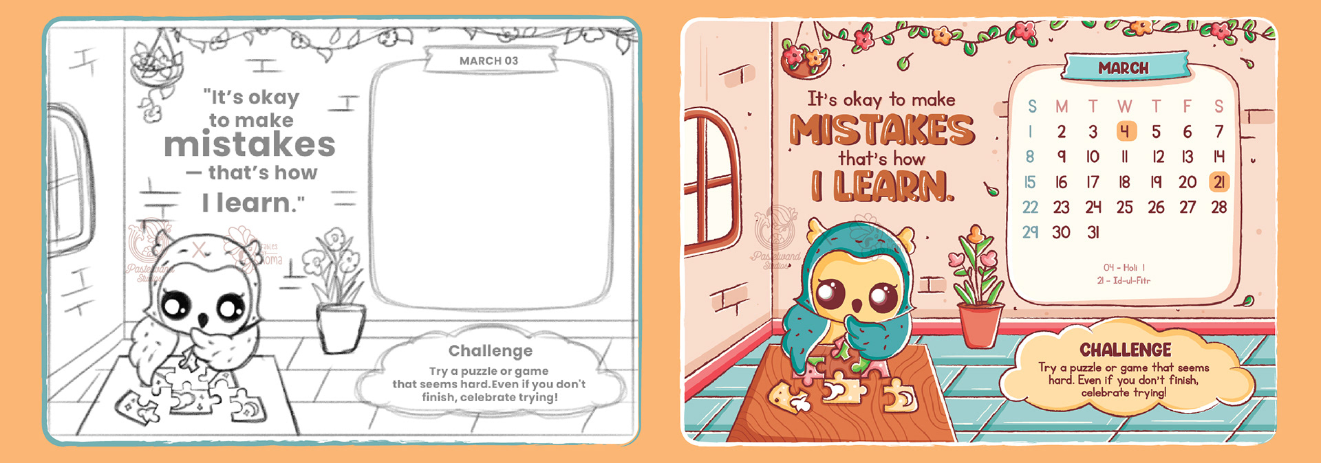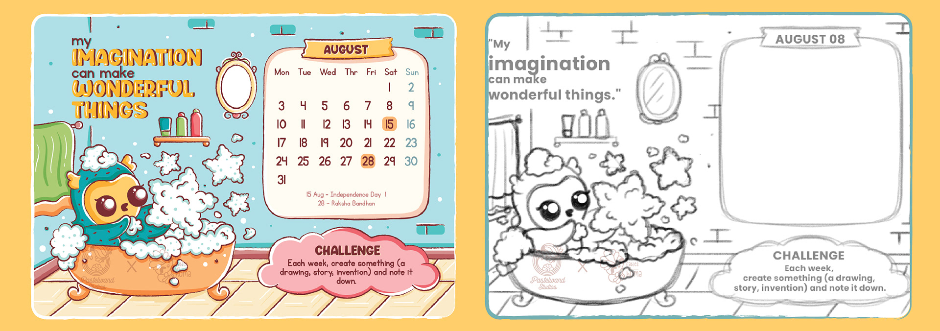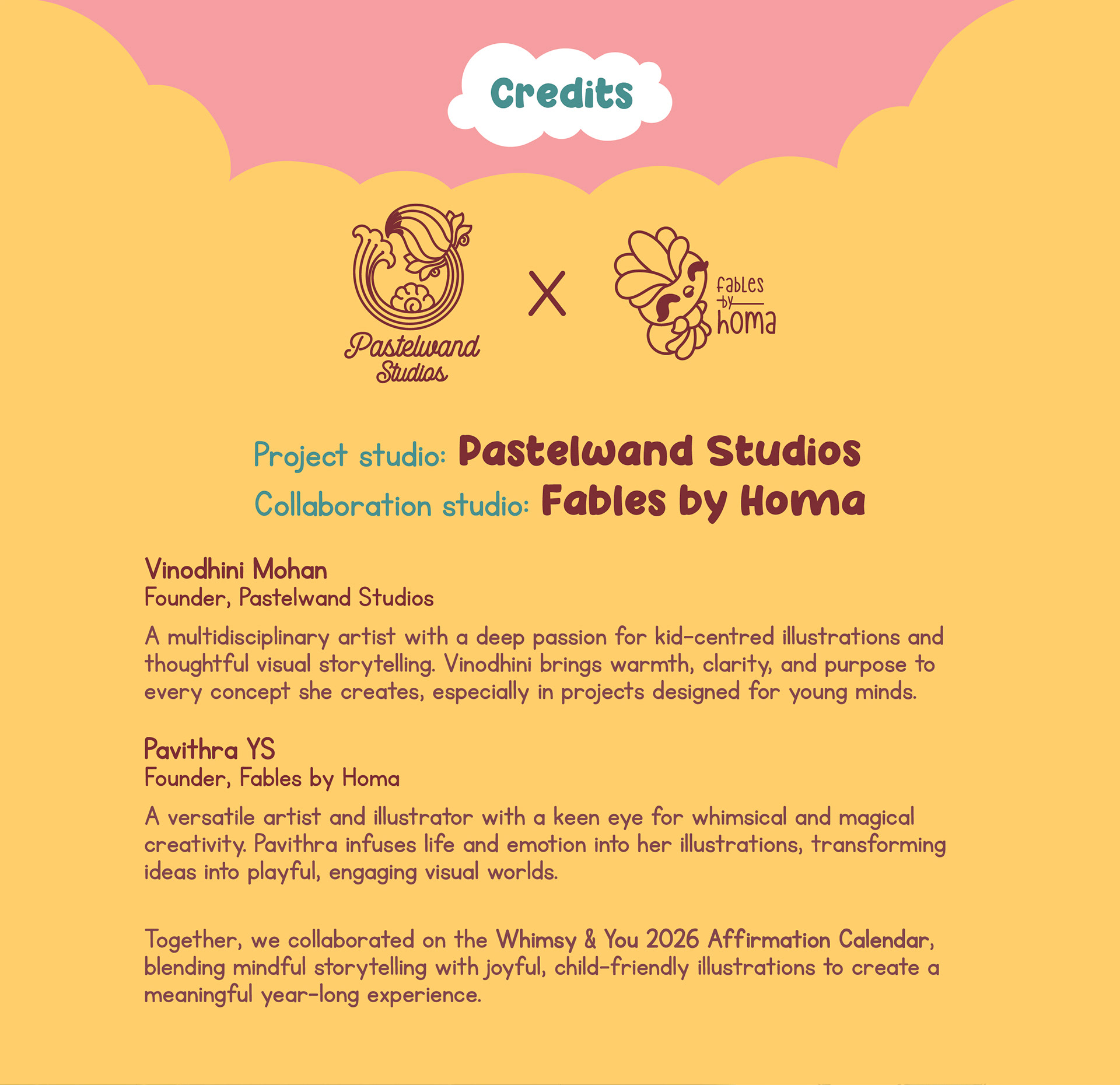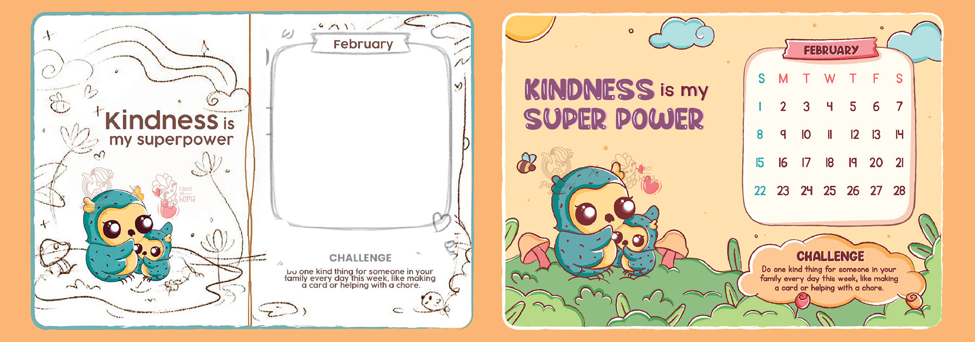 The Whimsy & You 2026 Affirmation Calendar was created to support children in building positive habits and emotional awareness in a simple, approachable way. Each month features a clear affirmation paired with a small, child-friendly challenge that encourages reflection, kindness, and mindfulness. The brand mascot, Whimsy, appears across all illustrations, helping reinforce each message through everyday, relatable actions. The calendar follows a postcard-style format, with the reverse side offering space for goals, gratitude, and important to-dos. Once the month ends, each page can be reused as a postcard or kept as a memory. Designed to sit on a desk or shelf, the calendar balances function and warmth for everyday use.